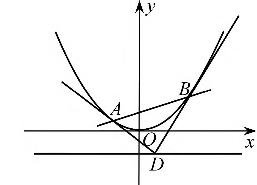 (2019年全国卷III理21题)如图 2,曲线\(C:y=\dfrac{1}{2}x^{2}\),\(D\)为直线\(y = -\dfrac{1}{2}\)上的点,过\(D\)作曲线\(C\)的两条切线,切点分别为\(A\),\(B\)。证明:直线\(AB\)过定点。