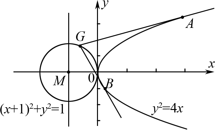 在直角坐标系\(xOy\)中,抛物线\(C:y^{2}=2px\)\((p>0)\)与直线\(l:x = 4\)交于\(P\),\(Q\)两点,且\(OP\perp OQ\)。抛物线\(C\)的准线与\(x\)轴交于点\(M\),\(G\)是以\(M\)为圆心,\(OM\)为半径的圆上的一点(非原点),过点\(G\)作抛物线\(C\)的两条切线,切点分别为\(A\),\(B\)。