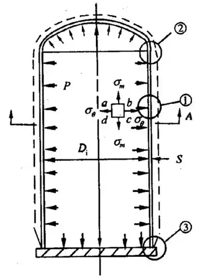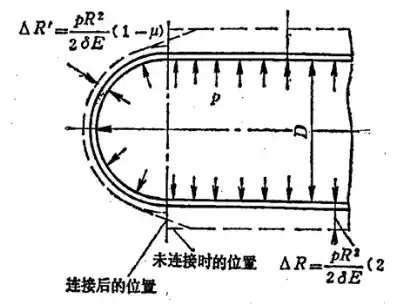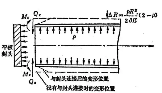 ②③段:由于筒体与封头的变形不同,其中筒体变形大于封头的变形,因此在这种连接处形成了一种相互约束,从而导致在附近产生附加的弯曲应力,称为边缘应力。