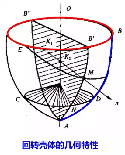 如图所示的回转壳体即由平面曲线\(AB\)绕\(OA\)轴旋转一周形成,平面曲线\(AB\)为该回转体的母线。