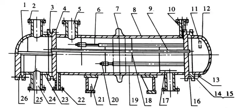 22-排液管;23-管箱壳体;24-管程接管;25-分程隔板;26-管箱盖