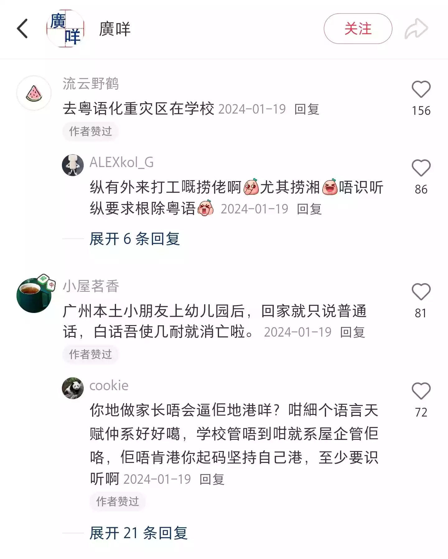 在社交媒体上,不少网友都认为,粤语消逝的原因是“学校推普”、“家长不教”,导致粤语传承从下一代开始断裂。
