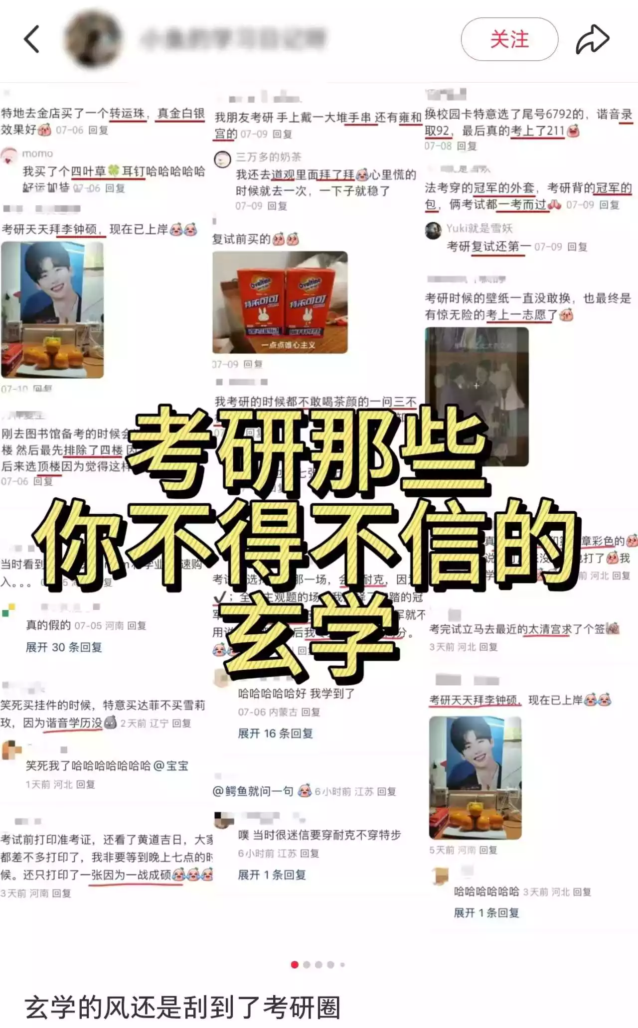 在考研话题下,超过半数的互动帖含有“玄学”元素。考生们自发形成一套完整的神秘主义体系:转发特定色系的“上岸神图”,在凌晨准点发布祈福弹幕,甚至衍生出“复试前吃紫色食物”(紫定胜)的饮食戒律。这种看似荒诞的行为,实则是将现实压力转化为可操作的“电子仪式”。
